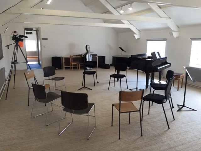 When we arrived at Snape Maltings we were warmly welcomed by Rebecca Knights (the artist development administrator at Aldeburgh Music in charge of residencies) who showed us to our working space, a palatial room at the top of the Britten-Pears music building equipped with no fewer than four keyboard instruments and (what we have taken to be) our very own music library! What an inspiring place to start our work and get the ideas flowing.
