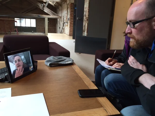 Our afternoon began with some more ironing-out of our plot in response to the morning's feedback, and at about 3.30pm we headed over to the upstairs lounge area in the Hoffmann Building, with its beautiful ceiling beams, in search of some wifi so that we could have a Skype meeting with Ben Willbond, our writer. Ben W is one of the stars and writers of the hit children's TV series Horrible Histories, and was taking time out of his hectic filming schedule for Series 3 of the comedy series Yonderland, in order to speak to us from the film studio's canteen. As an avid watcher of Horrible Histories (yes, I know it's aimed at children, but in my defence, I grew up on the books!), this was rather an exciting moment for me. Up to this point only Ben P had had contact with Ben W, so for the first time his involvement in our project was beginning to feel real.